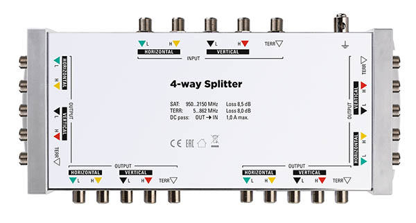 Polytron PSG 520S 4-weg verdeler voor cascade 5 IN, 4x 5 OUT. Deze splitter kan worden gebruikt om het signaal van een Quattro LNB te verdelen over 4 multiswitches.