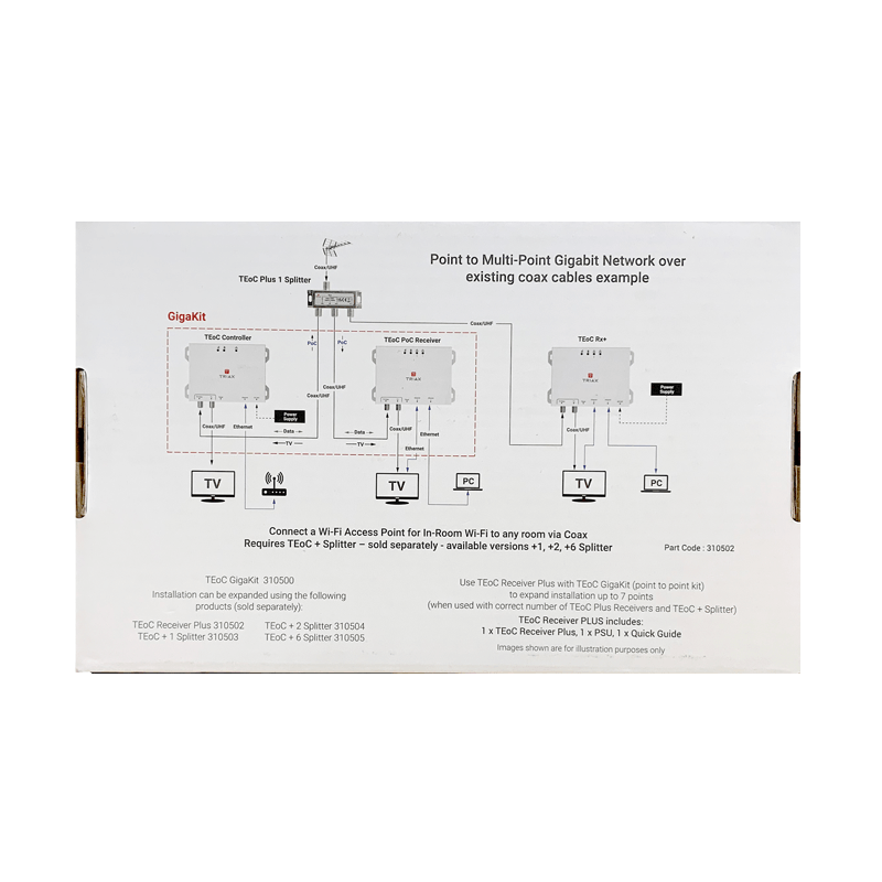 De Triax TEoC Receiver Plus is een ontvanger voor het transporteren van datasignalen via bestaande coaxnetwerken. TEoC staat voor Triax Ethernet over Coax en maakt het mogelijk om internet- of IP-signalen te versturen via aanwezige coaxbekabeling, zonder dat er nieuwe netwerkkabels hoeven te worden aangelegd. Dit maakt het systeem bijzonder geschikt voor woningen, appartementencomplexen, hotels en andere gebouwen met een bestaand coaxnetwerk.